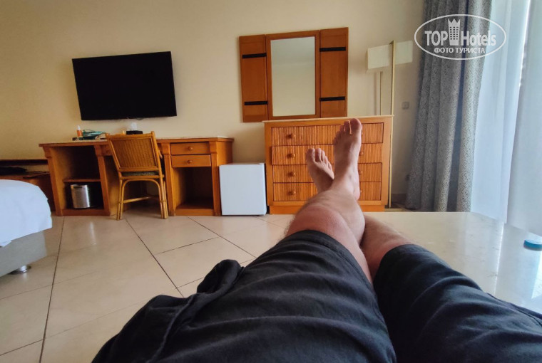 Насчет относительного размещения, нам не сильно повезло, номер (1342) находился прямо под тренажерным комплексом (утром бегают на дорожках, да гантели роняют) и Olympus баром, где по вечерам проходят шоу. Тем не менее, прекрасно высыпались и считаю звукоизоляцию достаточной. Мебель, не смотря на возраст, вполне в рабочем состоянии. Розетки классические 220В и подходят для приборов продающихся на территории РФ. Есть холодильник с пополняемым запасом питьевой воды, но мы его выключали (шумный). Сантехника в хорошем состоянии (унитаз, биде, раковина, душевая кабина), но с утра горячая вода (кран налево, значков где горячая, где холодная - нет) не сразу начинала идти, надо было слить остывшую за ночь первоначально. Есть фен. Набор по умолчанию: шампунь, кондиционер, лосьон для тела (в тюбиках), гель для душа (в диспенсере). Зубную щетку с пастой, говорят, можно попросить на ресепшне, но у нас было свое - подтвердить не можем. В чайном уголке - чайник, чай в пакетиках, растворимый кофе, сахар (все аккуратно пополнялось). Сейф маленький - документы, деньги хранить ОК, но ноутбук не поместится. WiFi у нас работал хорошо на всей территории отеля, включая пляж. Сотрудник рум-сервиса Ахмет поднимал нам настроение малыми скульптурными формами в виде цветов и лебедей из полотенец с декорированием из лепестков, и цветов. Ах да, можно попросить тапки и банный халат на ресепшне, но нам не пришлось - Ахмет по своей инициативе использовал их в очередной инсталляции.