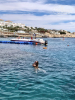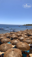 трехуровневый, на нижнем уровне занимают лежаки сразу, в 10 трудно найти, но в 12 многие уходят есть и освобождают их. На втором-третьем уровне всегда полно. Пляж общий с отелем Sport, но мест хватало всем. Лежаки с матрасами, столики, стулья, у зонтиков есть крючки для сумок и одежды, зонтики хорошие. Диджей ставил классную музыку. Аниматоры на пляже проводят зарядки, шоу, танцы, выступления, игры, боча. В прилив детки могут плескаться прям у пляжа. Понтон небольшой и удобный. Всегда сидит спасатель, следит. С понтона можно увидеть множество рыбок вблизи пляжа, живут под понтоном. Есть огороженная маленькая площадка для деток прям на пляже у моря. На пляже есть палатка, можно купить маски, круги и др принадлежности, цены не узнавали.