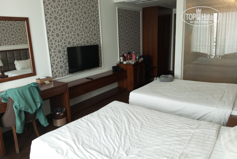 Немного хочу добавить информации по отелю. Если хотите заказать байк ( мопед) можно обратиться на ресепшен, за 150 тыс донгов Вам организуют мопед на день , есть конечно подешевле ( 100 тыс.донгов), но не хотелось искать в малознакомом городе . Перед отьездом оплатите минибар!!! Туда входит 4 бутылки воды Аквафина, 2 банки лапши, орешки ,чипсы, чай,кофе. Стоит это удовольствие 180 тыс донгов. Вода в бутылках с логотипом отеля бесплатная, каждый день добавляется. Напротив отеля,через дорогу в переулок хорошее кафе "MOC" (ул. Во Ван Киет 26) с морепродуктами. Средняя цена покушать порядка 200 тыс донгов, если отдельно брать морепродукты ( плавают на выбор в аквариуме) готовьтесь отдать порядка 100 $. Туда очереди, много японцев и китайцев. Кафе пользуется популярностью, бывают очереди. Дальше по этой же улице за кафе есть базар где можно купить фрукты, манго 30-40 тыс донгов, арбуз по 12 тыс донгов за кг,и прочее.