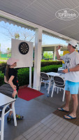 Ребенок играл с мужем в настольный теннис. В бассейне вода достаточна прохладная, я конечно нырнула с разбега) но доплыла до бортика и выскочила. возможно после обеда на максимально солнечной стороне вода прогревается, но детишки, которые плавали, выходили с синими губами и долго отогревались. есть бассейн для деток, он прогревался хорошо, но там вода 30 см глубина)) что не мешало взрослым заходить, сидеть и пить алкоголь (