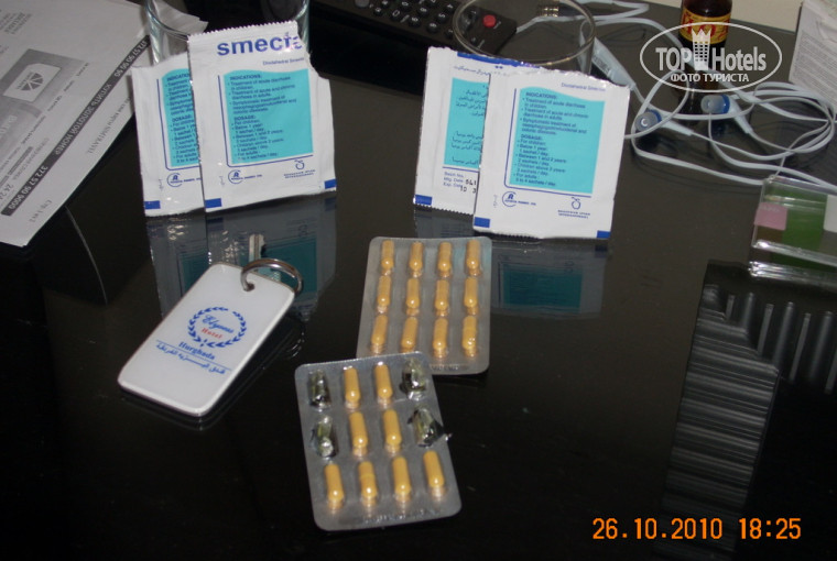 Теперь о главном. В отеле царит полнейшая антисанитария! С животами мучался каждый второй, если не первый. Для примера - мы с женой оба переживали эту проблему. На четвертый день началась диарея из-за чего речи об экскурсиях и походах в город быть не могло, приходилось постоянно находиться "в зоне действия туалета". В конце концов, пришлось обратится к врачу, который нам сообщил, что мы далеко не первые. Врач выписал лекарства (см фото1). Лекарства позволили в последствии долететь до Москвы без туалетных проблем. Все наши знакомые-постояльцы отеля и соседи также мучались диареей (кто-то из них обратились ко врачу, кто-то лечился самостоятельно). Изумляет то, что при вылете из России всех туристов предупреждают, что водопроводной водой в Египте даже зубы чистить опасно, однако в барах нормальной практикой считается сполоснуть стакан водопроводной водой и тут же не вытирая налить напиток. После нескольких дней непрекращающейся диареи брать напитки в баре мы перестали и проносили на пляж самостоятельно купленные в магазине напитки (надеялись, что это поможет).