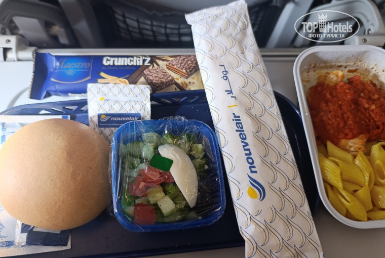 Перелет авиакомпанией Nouvelair Tunisia – также все хорошо. Несмотря на то, что перед вылетом аэропорт Внуково закрывал небо, в накопителе мы просидели лишнего не более получаса, самолет очень быстро подготовили к полету после прилетевших пассажиров, оперативно организовали посадку, и мы вылетели практически вовремя. Обратно также задержали на полчаса, долетели без происшествий. Время в пути 4 часа 20 минут над Европой. Аэробус А320 маленький, компоновка сидений 3+3, но довольно чистый и новый. Багаж 20 кг + 5 ручная кладь, ее не взвешивали. Багаж взвешивают общий на семью, чемоданы кладут друг на друга. Обратно у нас вместо 40 кг на двоих получилось 41,7, пропустили))) Также на вежливую просьбу посадить нас вместе и у окна, посадили именно так, и туда и обратно. Электронная регистрация вроде бы есть, но по факту не работает на сайте. Авиакомпания кормит при длительности полета более 3 часов, что огромный плюс перед нашими, у которых теперь даже на 6-часовых перелетах в Египет воды не допросишься. Напитки: газировка, вода, сок, чай, кофе. Еда: салатик, булка, вафли к чаю, горячее – макароны с курицей. Экипаж туда чуть говорил по-русски, обратно – даже на английском еле-еле.