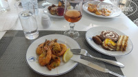 Кроме того, есть ресторан а ля-карт, запись на стойке за ужином. Вроде как в разные дни он заявлен как разный (тунисский, итальянский, рыбный) в одном помещении, но мы сходили один раз, нам попался рыбный, больше времени не хватило. В рыбном было все вкусно и прилично: салат с морепродуктами, суп биск, рыба запеченная с гарниром, брауни. Вежливое обслуживание)