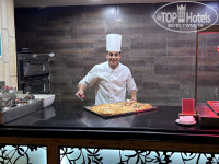 По питанию нам все понравилось, готовят вкусно и неостро, ассортимент всегда есть, блюда доносят. На завтрак: различные овощи, фрукты, сырная и колбасные нарезки, йогурты, готовят яичницу с наполнителями, есть готовая выпечка, либо пекут блинчики, особенно удивил и порадовал свежий мёд в соте. На обед и ужин пекут вкуснейшую пиццу, есть готовые блюда на раздаче и всегда готовят при тебе пасту, жарят мясо или рыбу. Несколько раз в неделю была рыбная тематика: готовили роллы, жарили креветки.