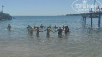 Пляж маленький, но есть шикарный пирс. Заход в море — сказка! Для детей вообще супер: лагуна без волн, много клевых рыбок плавает. Справа есть пещера — я туда залез, прикольно! Нам лежаков всегда хватало, но мы и приходили на пляж рано. Чтобы к 10 пойти на тусовку к бассейну, там реально весело и есть чем заняться.