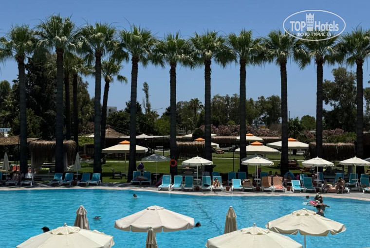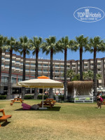 Территория отеля не очень большая. Пишу про основной отель, так как есть еще отель с отдельным въездом. На территории находятся 5 бассейнов. Один большой около ресторана, в котором проходит анимация, днем играет музыка. Рядом находится бассейн для грудничков, он очень мелкий, над ним натянут навес. Далее 2 бассейна с горками. Один с большими для взрослых, другой для детей. И еще один бассейн. Там нет музыки, меньше всего народу. Он нам понравился больше всего.