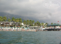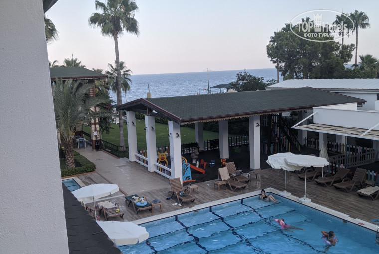 Прилетели рано утром компанией из десяти человек. Туроператор Пегас. Ехали без гида в тишине. Водитель просто открыл багажный отсек и высадил всех перед отелем. Дальше мы и сами знаем, но новичкам такой приём бы не понравился. При заселении вешают симпатичный браслет из бусин, а не традиционный браслет с кнопкой. Нашу семью из 4-х человек поселили в два номера на одном этаже. Вид на бассейн и сбоку море. Номера вполне приличные, светлая мебель, работающее освещение, нормальная сантехника. Душевая кабина. В санузле не дают индивидуальных моющих принадлежностей. На стене около раковины контейнер с жидким мылом и такой же с гелем в душевой. Обладатели хорошей шевелюры, запасайтесь шампунем дома. Кондиционер и минибар работали исправно. В холодильнике бутылка воды, один раз при заезде. Но вода есть в индивидуальных 200мл квадратных стаканчиках в холодильниках баров и ресторана, проблем нет. Ключ от номера обыкновенный, брелок для работы электричества в номере. Убирают номер через день, полотенца меняют, качество уборки хорошее. Сам отель компактный, всё под рукой. Расположен удобно, до пляжа очень близко. Сам пляж вполне нормальный. При заходе в море есть круглые камни, желательна обувь. Но есть удобный заход с пирса (можно смело прыгать) или оборудованного спуска. Море чистое, очень теплое и спокойное. Любители посмотреть подводный мир, могут проплыть вправо, под пирсами соседних отелей много рыб. Если хотите занять лежак, то это надо делать перед началом завтрака, иначе увидите, что все лежаки заняты. Территория отеля чистая, зелень ухоженная. К еде и напиткам претензий не было вообще. Завтраки стандартные с оладьями яичницей, сыром, колбасой и т.д. На обед и ужин всегда есть мясо, рыба, индейка и т.д. Для любителей диетического всегда есть отварная курица и отварные овощи, специально расположенные рядом. Сладкое разнообразно, пирожные, лукум, традиционные пропитанные сладости. Из фруктов были яблоки, груши, дыни и арбузы, ещё что-то. Много овощей. Но везде есть очереди, нужно занимать места перед приемом пищи. Анимация состоит из одного весёлого мужичка с шишкой из волос, который реально старается, и двух девушек. Были вечерние представления, соответствующие уровню отеля. В отеле явно экономят на количестве персонала. Если вы уйдёте с ужина, ваш стол не будут убирать 15-30 минут. Отель соответствует своей цене, если вы согласны занимать очередь перед приемом пищи и занимать лежаки перед завтраком, то всё остальное тут на высоте. Интернет на территории отеля только платный, 10$ за семь дней. В течении пары недель могу ответить на вопросы.
