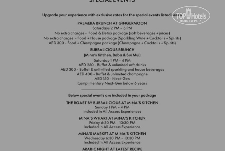 Завтрак в W до 12! ч. (обязательно, в отеле проживания). Обед и ужин в каком захотите отеле (главные рестораны-шведский стол, в W - а ля карт), либо в любом из 12 ресторанов а ля карт в любое! время их работы (у каждого свои условия заказа, напитки безлимитные (в т.ч. свежевыжатые соки) есть возможность заранее забронировать столик) После трапезы на чеках расписываетесь (не пугайтесь цифр (это для отчетности)) В барах просите меню для AI (Бар в W только для постояльцев)