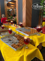 Ресторан — отдельная похвала. Слегка не понравилось, что меню однообразное, но всё очень вкусное и качественное. Есть иногда всё таки разнообразность: каждый день что-то вкусное, а блюда вкусные и свежие. Утром — сыры, яйца, йогурты, выпечка, фрукты; на обед и ужин — мясо, рыба, гарниры, салаты, десерты. Дыня и арбузы были всегда сладкие, как мед. Напитки стандартные, но качественные. В баре кофе, соки, прохладительные напитки — и всё быстро, без очередей. Бармены приветливые, не ленятся улыбаться.