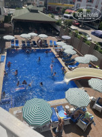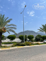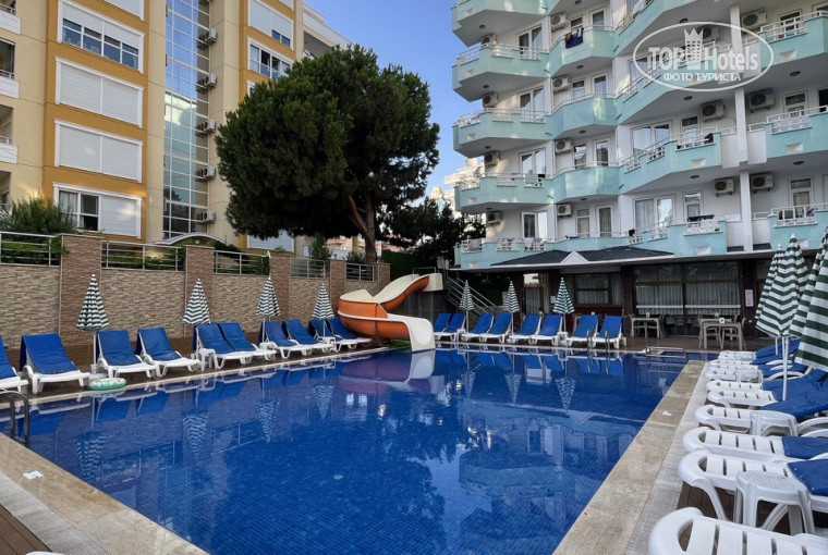 У самого отеля территории почти нет, только бассейн с горкой (включают раз в день на час), но зато расположение отеля очень удачное - внутри большого района Махмутлар: рядом магазины, обменники, кафе и прочая жизнь, есть где погулять хоть днем хоть ночью. И в тоже время до моря и пляжа идти буквально 5 минут, очень удобно. У отеля свой кусок пляжа с лежаками, ВСЕГДА при любой загрузке отеля в любое время есть свободные, очень ответственный мужчина на пляже работает - сделает все для вашего удобства.