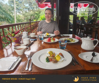Завтрак в данном отеле который включён стоимость, заслушивает отдельного внимания. Порции конечно небольшие, но одному человеку наесться можно самое главное эта подача блюд, все очень красиво а главное вкусно. На завтраке можно было выбрать одно из представленных на выбор блюд также можно было заказать фреш, чай,кофе а так же фруктовая нарезка, блинчики три вида с разной начинкой а так же были на выбор блюда из местной кухни но заказать можно было что то одно,одним словом подача блюд была восхитительной как в каком-то очень дорогом ресторане. Единственный минус этого отеля это расстояние до центра Убуда, ехать сорок минут, но отель предоставляет бесплатный трансфер в десять часов утра.И обратно в 16-45 вечера.
