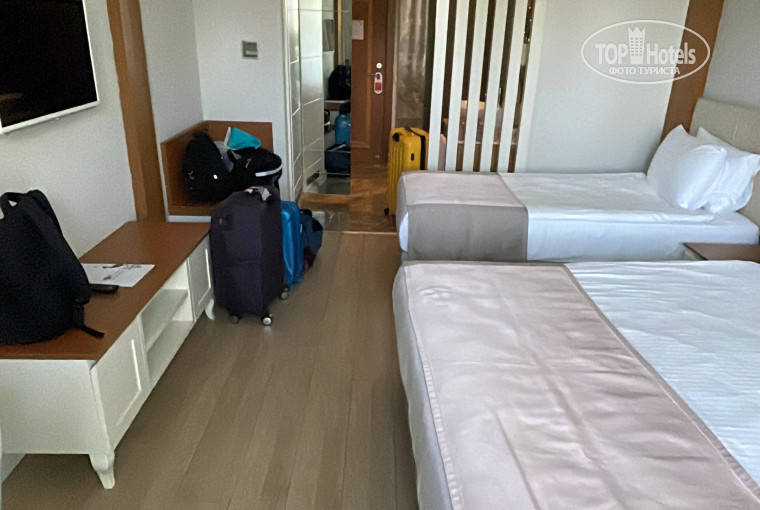 Номер. Мы проживали в номере стандартной категории с видом на зеленые окрестности. Номер просторный, чего хватило на четверых. Из мебели: удобная двуспальная и односпальная кровать, шкаф, комоды. Из техники порадовала наличие кофемашины. Кондиционер работал безупречно. Отдельно хочу выделить систему All Inclusive Premium в номере: мини-бар ежедневно пополнялся совершенно бесплатно! И не просто водой, а соками, газировкой (Fanta, Sprite, Coca-Cola), пивом, минералкой и кофе. Это тот уровень заботы, который встречается далеко не везде. Уборка проводилась также ежедневно, всегда чисто и аккуратно.