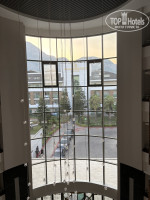 Шикарный вид на горы из бассейна и особенно пляжа. Вход в море песок-галька, заходили без обуви норм. Красивая ухоженная территория отеля. Шикарный фонтан, который включали вечером.