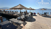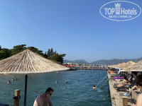 Большой, чистый, хорошо оборудованный (душ, раздевалки, туалет, бар) . Есть пологий песчанный вход и пирсы с поручнями, + плавучий островок. Море очень чистое и прозрачное, много рыбы. С пляжа ШИКАРНЫЙ вид на залив Мармариса и острова! Официант весь день разносит напитки.