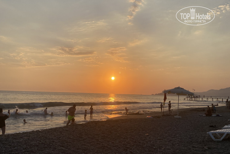 Изначально был забронирован номер без балкона, но на ресепшене за символическую плату без проблем предоставили номер с балконом да ещё и с боковым видом на море. Персонал приветливый. Еда в отеле нормальная, без особого разнообразия, всегда есть курица/индейка, рыба, голодным точно не останешься. До моря рукой подать, буквально 2-3 минуты и ты на море. Лежаков всегда хватает свободных. Вход в море проблематичный - плиты и камни, также большие волны на пляже, поэтому особо не поплаваешь.