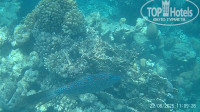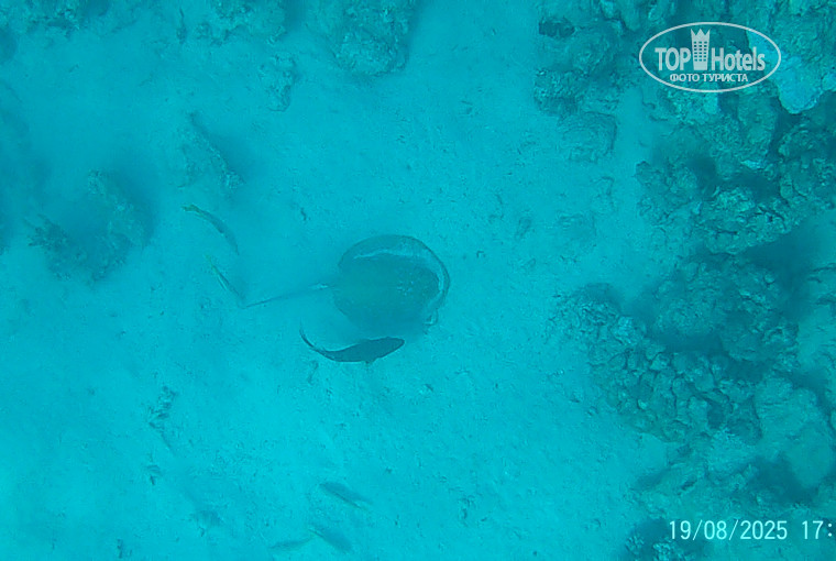 Рыба. В основном, набор стандартный: много попугаев, бабочек, хирургов, пикассо, флейты, иглы. Плавают стайки мелких барракуд, огромные балистоды (триггер), иглобрюхи и литрины. Несколько раз видели одиночных огромных барракуд. Много скатов. Довелось увидеть орляка и мурену. Мурена точно живет на рифе Фанары. Огромная змеюка вылезает вечерком. Ближе к деревянному понтону, в сторону маяка есть еще актинии с клоунами. У нашего понтона на ближайшем рифе лежит рыба крокодил. На нашем пляже, до рифа встретили камбалу.