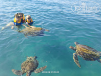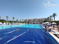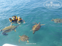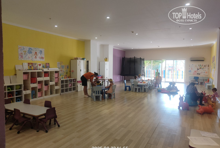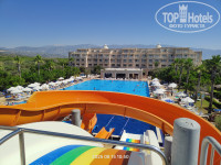 у рецепшена никого. Пришел сотрудник , быстро все заполнили, он дал карточку от номера. (Мы в травелате заказывали номер - superior sea view. ) И ожидали, что вид будет прям на море, наивные). Номер на третьем этаже, просторный, без ванны, с душевой кабиной, с большой кроватью и двумя отдельными односпальными кроватями . Вышли на балкон, ночь, спереди ничего не видно, гора и дорога, смотрим, море где-то далеко, вид боковой, виден кусочек его. Я сразу спустился на рецепшн, попросил , чтоб нам поменяли номер, мне дали понять, что номеров свободных нет и категория нашего номера соответствует заказанному. Я спорить не стал, решил подойти на следующий день. Пошли на ночной суп, ресторан показался маленьким, супы - на любителя). Вышли к бару , смотрим, лежат собаки, кошки ходят, первое впечатление ну так себе, хотя я про это знал. Скажу наперед, все животные дружелюбные, никаких лаяний, рычаний не было, мы в итоге подходили потом и гладили всех. На следующий день сотрудник поменялся, я попросил заменить номер, он сказал, что через пару дней освободится похожий номер , но он будет тоже с боковым видом на море. Я попросил с видом на бассейн и море, на что он сказал , что за такой номер нужно будет доплатить примерно 10евро в сутки. И попросил подойти через пару/тройку дней. Контингент - в первые дни пребывания были в основном поляки и турки, а русских было очень мало, сначала даже обрадовался, но через пару дней уже хотелось услышать русскую речь. Жаль только , что так и не сходили в сауну/хаммам в первые дни. Они, кстати, бесплатные. Тренажёрка толком не охлаждается. В итоге, через трое суток нам показали огромный номер на последнем четвертом этаже, с видом на бассейн и море, просто люксовый, с двумя большими балконами, кухней, большая джакузи на балконе под открытым небом, два шезлонга. Оплатил в итоге 60долларов за 6ночей. Не пожалели, номер действительно оказался суперский. Единственный минус был, что кондей тяжело справлялся с такими площадями и , когда оставляешь кондей на полдня, не было прям холодно. И с каждым последующим днём в отеле ощущались только плюсы. Уборка в норме, делали фигурки из полотенец, душевые принадлежности - диспенсер мыла и все (никаких отдельных тюбиков одноразовых не было). Тапочки есть. Воду каждый день приносили в бутылках 0,5 на человека. От комаров ничего не потребовалось, их практически нет, не кусали. На территории стоят холодильники с водой , там стаканчики как йогурты только с водой, первый раз такие вижу. Подходишь сам , берешь сколько нужно. Горки, бассейн - супер. Отмечу нюанс - на горках плоховато следят за очередностью, в первый день меня это поднапрягло. На радужной горке иногда катятся сразу по двое и бывает, неудачно влетают друг в друга. В бассейн разрешают всем прыгать , но это даже плюс для нас(дети научились нырять рыбкой), а глубина в основном бассейне 1.40м. Есть отдельно бассейн для маленьких с горками. Не мешало бы повесить табло с градусами температуры воды/воздуха у бассейна, было бы очень удобно. Полотенца на шезлонгах оставляли некоторые туристы на ночь. Я рано утром выходил на пробежку вдоль пляжа и заодно занимал шезлонги. Как-то раз наше полотенце пропало, но без проблем, без разбирательств нам выдали новое. Море шикарное, не холодное, камней нет, аквашузы не потребуются, плавный вход, потом постепенно глубина. Живности нет, рыбки 