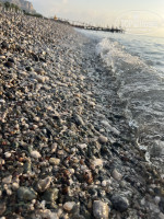 Есть еда у моря, открывается в 12: суп, немного овощей, пицца и картошка фри (не вкусно совсем), пару горячих блюд, в принципе поесть можно.