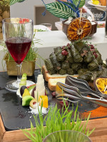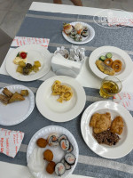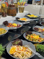 Очень много видов хлеба , различные добавки масла, соусы и так далее. Также много различных овощей и зелени, сырной и мясной нарезки.