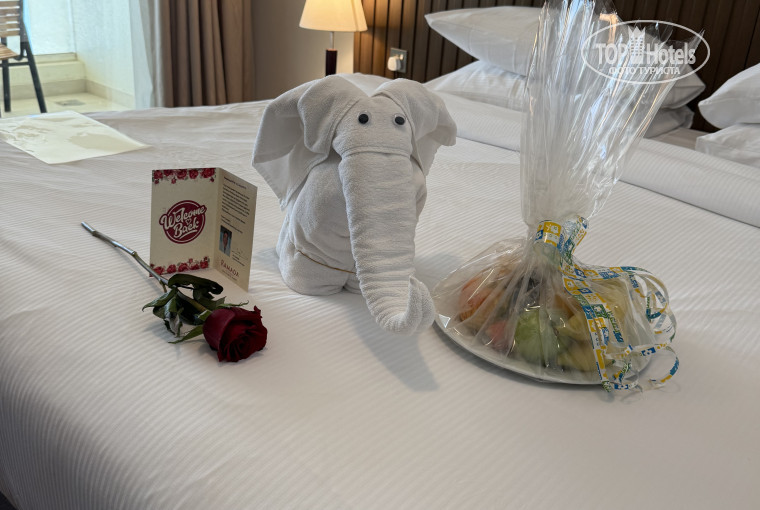 Хочется выразить слова благодарности каждому причастному к нашему отдыху! Мы знали куда едем и чего ждать, но даже тут сотрудники отеля постарались-так как мы повторно приехали, нам апгрейдили категорию номера, с видом на залив, в качестве комплимента фрукты, розочка, сопроводительное письмо, а позже еще и пакет с различными вкусняшками (орешки, конфеты, печеньки)!