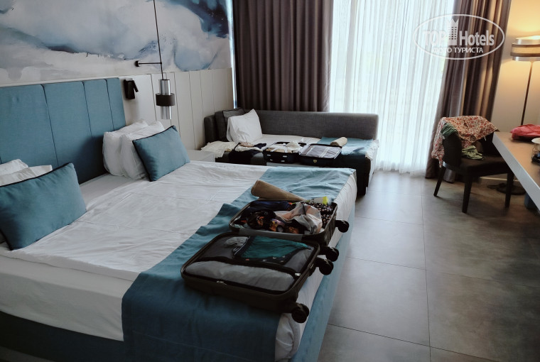 В холле стояли какие-то приветственные компоты и лукум... не особо ...Отправились на завтрак, с шампусиком.. и осваивать территорию.Походили-осмотрелись, искупались... подошли, как и просили, выслушали монолог-раз номер без определенного вида, ни чего достойного предложить не можем, ни чего не готово, гуляйте дальше...до 14-00...ок.... пошли дальше наслаждаться отдыхом... пообедали, и второй заход на заселение... номер не готов, еще чуть-чуть и будет вам счастье... ок... погуляли, посидели в баре... и только с третьего раза удалось заселиться, в 15-00,с успокоительными словами, что номер не плох, выдали карточки и проводили до дверей... №1226...1(3) этаж, с видом на крышу ресторана и ...море..на дворик кофейни с арфисткой.