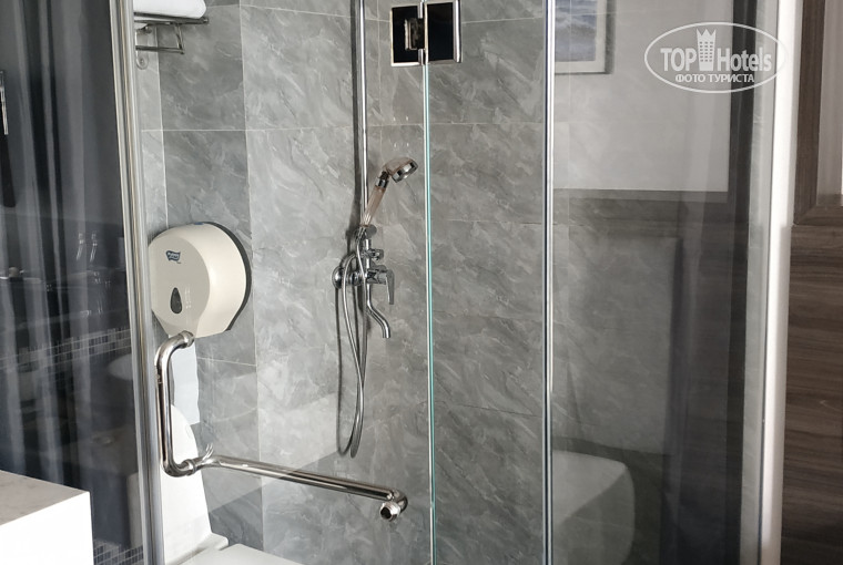 4. В маленьких комнатах стеклянная кабина объединена с душем и унитазом. Стеклянная стена санузла закрывается шторкой. В комнатах большего размера душ отделен от унитаза стеклянной кабиной.