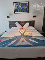 Отдыхали с мужем в этом отеле с 25.09.2025 по 01.10.2025. Приехали в отель в 11ч утра и нас сразу заселили, что очень порадовало. Номер был просто супер, с выходом к бассейну и видом на море. Чистое и новое белье, полотенца. Меняли каждый день. Ребята которые убирали номер радовали нас каждый день разными фигурками из полотенец на кровати). Мини бар заполнен напитками и это входит в стоимость, если только нужно было пополнить тогда за отдельную плату. Водичку по 4 бутылочки приносили каждый день. Да были небольшие шероховатости, не работал телевизор, но не телевизор же мы приехали смотреть) Пару раз не открывалась дверь с карты, но тут же мгновенно нам ее наладили. Вай фай был в номере, но с перерывами. И это тоже небольшой минус. нечего сидеть в интернете)) В общем мы приехали наслаждаться солнцем, морем и отдыхать вдвоем от суеты и для этого были все условия. Еще скидка на то что отель только открылся и частично ведутся доработки на территории, но нам это совсем не мешало. По любому вопросу реакция была мгновенная. У меня было день рождение и только для нас двоих открыли Итальянский ресторан и обслужили на высшем уровне, я была в восторге от такого супер внимания)) А вечером аниматоры Бойко и Сосо устроили нам дискотеку в честь моего праздника. Огромное спасибо всем сотрудникам, они невероятно вежливы и отзывчивы, иногда это даже смущало))