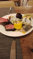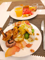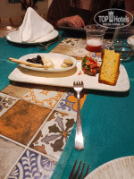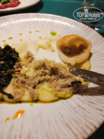 Большим разочарованием стал поход в "итальянский" ресторан ля кард. Обставлено было все неплохо, красивые бокалы, тканевые салфетки... И на этом всё. Выставили типа комплимент от шефа (на фото) - солонющие до невозможности шляпки шампиньонов, фаршированные не менее соленым сыром, бутербродик с салатиком и ломоть хлеба с приправами, ну и оливки. Ладно, приносят меню - 5 листочков Х12 блюд... 3 вида пиццы, мы заказали простую Маргариту, равиоли, пасту, ризотто (размер порции - столовая ложка), лично я соблазнилась на фаршированного кальмара, в описании было написано что фарширован смесью морепродуктов. Молодёжи заказ принесли достаточно быстро, затем пицца, дети сказали что равиоли в обычной нашей шведскостольной столовой гораздо вкуснее, пицца была абсолютно такая же, а кальмара мне пришлось ждать больше часа и 2 раза напоминать о нем, походу просто забыли, а когда принесли я была в шоке. Начинка - тупо рис, никаких морепродуктов там и в помине не было (на фото). Вобщем, пошли мы оттуда нормально поесть в корпус:) Даже не тратьте время на эти понты, никакого удовольствия.
