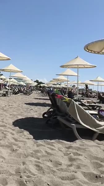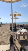 Подкрепившись, решили пойти посмотреть на море. Найти его оказалось довольно просто, нужно было пройти через парковую зону, в которой расположены домики-"виллы", буквально 3 минуты и мы уже на пляже. Сначала идёт несколько рядов "шатров", они платные, но нас совершенно не заинтересовали, поэтому цену не узнавали, дальше уже около стационарных зонтов гнездятся шезлонги, обычно по 2-3 около зонта + большой пластиковый табурет, заменяющий здесь столик + керамический горшок, который тут служит урной - комплектация пляжного места. Шезлонги хорошие, крепкие, их много, ни разу в любое рендомное время не было такого, чтобы мы не нашли свободные. Сам пляж отсыпан крупным серым песком, скорее смесь с ракушняком, но у кромки моря начинается галька, поэтому еще совет - берите с собой аквашузы если у вас нежные пяточки. первые пара метров довольно резкий спуск по гальке, но она прекрасно обкатана морем, не поранитесь, а вот выбираться на берег немного затруднительно, особенно с волнами. Кстати, после заката и в шторм по береговой линии натягивают канат, купаться запрещено. Днём на пляже дежурит спасатель на вышке.