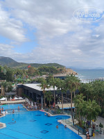Отдыхали с мужем и ребенком 5лет, с 29.09-8.10. Прибыли в отель около 12, сразу не заселили, одели браслеты, сказали можно пользоваться услугами и сразу дали пароль от wifi. Около 14, подошли к рецепшн, ещё не готово. В 14:15, нас позвали заселяться. Молодой человек,взял наши чемоданы и проводил в наш номер, не уходил пока не дали ему чаевые 🤔. Увидев свой номер были в шоке, типо балкон находился в коридоре и мы видели дверь в соседний номер 🤣. Сразу схватили чемоданы и обратно, разбираться. Я бронировала с видом на окрестности, номер стандарт а не эконом. Сразу предложила другой вариант, тоже не бомбический конечно но получше, и мы не собирались находится в номере целый день, только спать. Балкон был с видом на крышу,а внизу кухня. Когда мы переезжали в другой номер,нам уже никто не помогал с чемоданами 😄. Номер нормальный, чай,кофе, чайник, кружки, стаканы, блокнотик для записей, карандаш, гели шампуни большые бутылки прикручены к стене, нажимаешь дозатор и все, маленьких не было бутылочек. Тапочки были одноразовые,халаты, полотенца. Сейф бесплатный в номере в шкафу. Так же было ватные диски, иголки -нитки в мини упаковке. Ложка для обуви. Дополнительные 2 подушки. Мини бар пополняли регулярно, если все успевали выпить. Если кола оставалась, то не дополняли ее а остальное все доступно. Постельное белье и полотенца, халаты нам меняли каждый день 👍, но мы оставили по 1-2 €. Отель понравился, территория компактная, все доступно. Есть горки водные, детские и взрослые. Нас немного разочаровало питание, в первые дни было изобилие еды, ребенок ел йогурты в баночках и пюре фрутовые были. Мясо рыба была несколько вариантов. Но с 1-2 октября все волшебное закончилось, детского питания не было, даже этот детский холодильник был выключен. Из фруктов были бананы,яблоки,груши деревянные, нектарины твердые. Арбуз и дыни не бомбические, ожидала большего. На завтрак не знали что поесть, глазунья -надо стоять ждать пока поджарят, омлет -очередь 15минут, вареные яйца всегда были, фри, нагентсы и луковые кольца во фритюре 24/7. Но на завтрак извините меня,я такое не хочу. Каша была один вариант и то, или с изюмом или с курагой или ещё чего насыпят. Колбасы и сыры много вариантов, и выпечки много и тесто вкусное. Сосиски были всегда в каком то томатном соусе, выглядит это ужасно. И не все любят такое. На обед тоже ходили в поисках еды 😀, много видов макарон,но опять же то в томате, то острое, то травы и специи какие то много. Рис с фисташками. Про супы я вообще молчу, какая то жидкость то молочная то томатная, то мутная 🤔. На ужин были рыбки, форель , скумбрия но они все были пересушены на мангале . Думала около моря будет разнообразие море продуктов , оказывается нет . Очень питание разочаровало. Слышала что конец сезона ,и особо уже не напрягаются. В снек баре еда была кстати вкуснее чем в ресторане . Потом ходили туда на обед ,пиццы, денер-курочка , лепешки, мороженое фрукты . Один раз посещение ресторана а ла карт, бесплатно. На выбор лосось, дорада, сибас. Сначала наливают рыбный суп, наваристый. Потом приносят рыбу, которую выбираешь заранее. И дессерт шоколадная масса, типа крем брюле что то. Анимация хорошая, но вот 2 дня была плохая погода все гости практически были в отеле и не знали чем заняться. То есть у них программы только для улицы. И в плохую погоду,к сожалению мы попали на 2 дня дождей, не 
