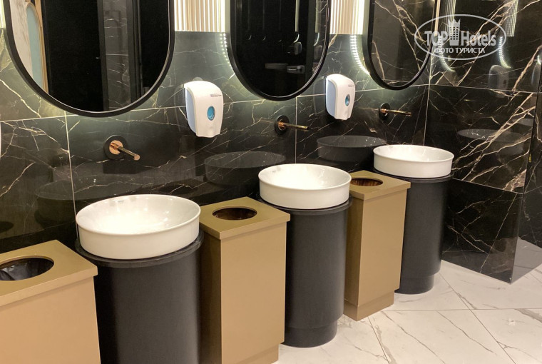 Отсутствуют зубные щетки, паста. Из наполнения номера – ватные диски и палочки, мочалки, халаты, тапочки, шампунь+гель и бальзам, мыло.