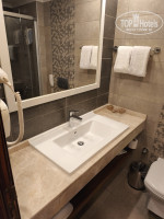 Номер попался небольшой, на втором этаже корпуса «В». Балкончик совсем маленький, только белье посушить, сесть не получится. В других корпусах балконы полноценные, нам и так нормально было. Вид из окна на соседний корпус. На столе обнаружили приветственную бутылку вина, которую сразу же опорожнили, печенье, в холодильнике две бутылочки фанты и две колы, 1.5 литра воды. Холодильник постоянно пополняли. В ванной комнате чистенько, мыло, гель для тела и шампунь из емкости на стене, отдельных флакончиков не было. Полотенца меняли ежедневно. Халатов и одноразовых тапочек не было, но они нам и не нужны были. В прихожей в шкафу есть сейф (не пользовались), несколько вешалок. Вешалок маловато, всю одежду не повесили. В номере имелся телевизор, встроенный в зеркало. Каналов много, но российских нет. Телевизор мы не смотрели.