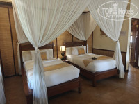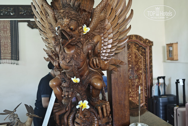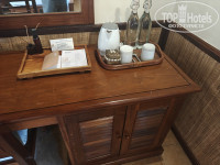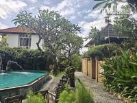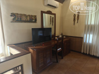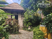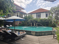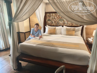 В отель добрались как раз к заселению к 14 часам. Нас попросили подождать, так как номер был не готов. Странно, конечно, но стали ждать (точнее сходили покушать, так как были голодны после многочасового перелета). Заселили нас только в 14:40 (по этой причине снизил оценку). Угостили прохладительным напитком. Персонал по русски не говорит абсолютно, только английский, и то с азиатским акцентом. Вилла досталась прямо в центре отеля рядом с рестораном - номер 304. Вилла в два этажа, на каждом свой санузел - на первом этаже не только душ, но и ванна, а на втором только душ). Внутри очень уютно, все необходимое в наличии - достаточное количество розеток, шампуни, фен, холодильник, чайник, кружки, чайный набор, телевизоры с интернетом на каждом этаже. Были легкие хлопковые халаты (не махровые), зонтики. В холодильнике - платный минибар. В номере было блюдо с фруктами в честь заезда. С питьевой водой странная ситуация - впервые с таким сталкиваюсь: изначально при заселении ставят две стеклянные бутылки с водой, и все. Впоследствии ты сам должен ходить с этими бутылками на рецепшен и наполнять их из кулера. Очень странно для отеля 4 звезды (за этот момент тоже снизил оценку). Вилла ограждена забором со своей персональной калиткой - никто не мешает, как и было задумано. На второй этаж можно попасть как через главный вход, так и через отдельную дверь, что очень удобно (два раздельных ключа). На первом этаже была большая двухспальная кровать (высокая, крепкая. с балдахином), а на втором - две полуторки. В нашей вилле бассейна не было, а вот в соседней №305 - был свой маленький. Всего в отеле два бассейна - один рядом с рецепшеном, второй за рестораном в другой части отеля. Глубина в обоих - 1,6 метра. Даже мне было глубоковато - стоять можно только на цыпочках. Для людей небольшого роста - очень неудобно. Было бы лучше, что глубина была изменяемой (под уклоном) - от 1,3 до 1,6 метра. Небольшой "лягушатник" для детей только во втором бассейне (за рестораном). Рядом с обоими бассейнами имеются туалеты. Сама территория хоть и небольшая, но очень зеленая и ухоженная. Но никакой живности, кроме комаров, мы не видели. Комары местные очень маленькие и злые, место укуса потом сильно чешется. В номере была только бутылочка с ароматическим маслом, которая по идее должна была отпугивать насекомых, но мы не сразу разобрались - что это такое, и не сразу стали ей пользоваться. Купили в магазине пластинки с репелентом - и проблема ушла. Но в один из дней, вроде в среду, нам в ячейку (типа почтового ящика у дверей виллы) положили листок с предупреждением, что в этот день будет обработка территории от насекомых, и просили извинения за возможные неудобства. И реально обрабатывали в то день. Кондиционер в вилле работал хорошо, но наружный блок был слегка шумноват. Интернет работал по всей территории отеля, но как-то странно. То скорость хорошая, то ужасные тормоза (за это тоже минус).