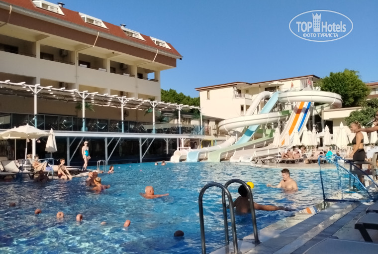 По отелю: отель небольшой, состоит из 6 небольших корпусов, расположенных по периметру участка. Бармен Ибрагим лучший, всегда улыбчивый, отзывчивый. Во внутреннем дворе расположен бассейн с 5 горками, горки хорошие. Есть уличный бар с неплохим алкоголем, большая веранда со столами. Днём, возле бара, готовят вкусные булочки и лепёшки. Есть небольшой амфитеатр,где ежедневно проводились разные концерты и шоу.