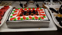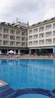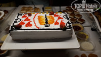 Ресторан находится на первом этаже. Посадочные места, как в зале, так и на улице, с видом на бассейн. Мест много, всегда можно найти свободный столик. Столик с напитками стоит отдельно, на нем в бокалах красное, белое и розовое вино. Кому нужно что-то другое, в двух шагах бар. Напитки, в основном местного производства, но все из бутылок (кроме пива) и хорошего качества. В ресторане питание достаточно разнообразно: два вида мяса и птица, курица и индейка, рыба каждый день, также блюда-гриль, рыба, кебаб, овощи и птица. Фруктов достаточно много: утром, в обед и вечером, дыня, мандарины, апельсины, сливы, яблоки, груши, виноград, хороший сладкий стол, утром халва, лукум, много разнообразной выпечки, на ужин пахвала и большой выбор пирожных. В течение дня около бассейна работает бар, после обеда с 15-16 мороженное, потом печенье, кексы, бисквиты.