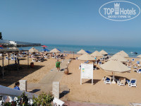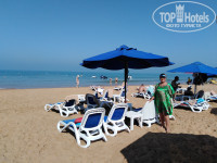 Это – главная «фишка» отеля. Именно из-за него сюда соотечественники приезжают по несколько раз. Пляж очень чистый, песочек бархатистый, вход в море пологий, водичка прозрачная, мусора в воде нет. Красота! Слева пляж ограничен 100-метровым волнорезом, в результате чего образуется небольшая бухта. Размеры зоны для плавания, ограниченной буйками, 150 на 100 метров. Заплывать за буйки строго запрещено (дежурят постоянно 2-3 спасателя). Лежаки все новенькие, удобные. Их всем хватает, но мы с женой по «вредной» привычке (приобретенной в Турции и Египте) ежедневно в 7.00 резервировали «козырные» места на первой линии для нас и друзей (они – сони).