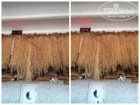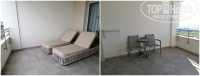 На террасе стульчики и стол, сушилка для купальников с прищепками и обалденные лежанки, они легко двигаются по направлению к/от солнца в зависимости от потребностей. По моему мнению такой номер идеален для отдыха, если непогода или ветрено, то можно возлегать на этих лежаках, не вылезая под дождь на улицу. Защита от насекомых плотная штора, сетки нет.