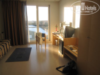 очень простенький, квадратненький. кровать удобная, телевизор старенький, ручек и писчей бумаги не увидели, как и зубных щеток и других нужных мелочей. в номер мы уборщиц не пускали, т.к. сильно не мусорили)) и потому что в первый день покурили в окошко, а потом проветривали остальные дни (штраф за курение в отеле 65 евро). место для курения, кстати находится на первом этаже, с посредственной вентиляцией и сидениями как в больнице. окна в номере во всю высоту, балкона не было. на столе встречала розочка и две бутылочки по 0,2 красного и белого вина. халаты, тапочки и полотенца чистые. мебель старенькая. ремонт самый простой, но аккуратный. в ванной есть фен и мыло.