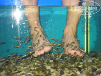 на втором этаже находится салон красоты и процедурные кабинеты. перед выездом бронировали одни процедуры, а по приезду выдали талоны на совершенно другие и в неудобное время. но удалось договориться на то, что хотелось. в итоге я сходил на общий массаж (попал к мужчине, который увлекается восточной медициной, размял так, что я вспомнил массаж во вьетнаме, когда не столько наслаждаешься, сколько стискиваешь зубы от боли, но я так люблю, вышел от него- меня расслабило так, что язык ватный стал), пилинг коричневым сахаром- фигня, но приятно)), девушка на массаж с горячими камнями (не так как во вьетнаме, но девушка вышла оттуда щасливая), общий массаж (попала к женщине, которая вместо массажа поводила руками по коже, зевала и говорила сама с собой по эстонски), уход за лицом (масочки, массажики). и вдвоем мы сходили на "педикюр с рыбками"...вот это стоящая штука хотя бы в плане своей необычности! мы сразу вдвоем опустили ноги в аквариум с маленькими рыбками и под звуки морского прибоя (из магнитофона) эти рыбки стали кушать омертвевший эпидермис. ощущения крайне интересные)) тетенька сделала нам чаю, а после того, как рыбки пообглодали нам ноги, натерла ступни маслом.