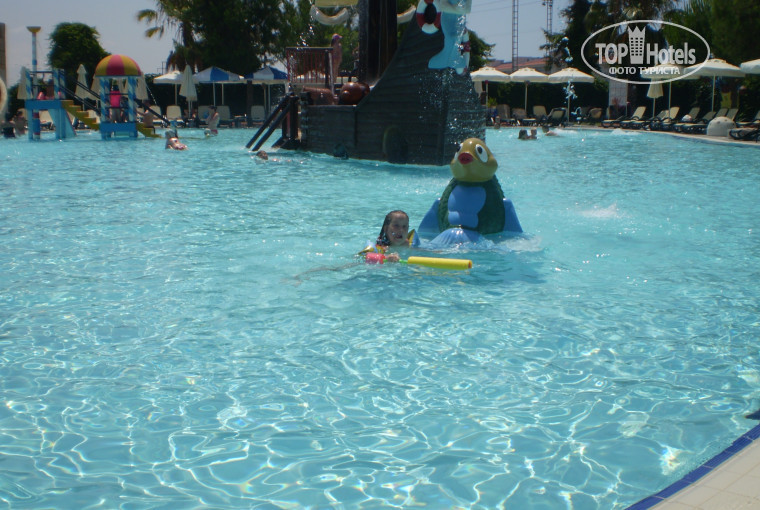 Отдыхали вдвоём с дочкой 6 лет с 23 июня 2010 года.В турции были первый раз,да и вообще на море!Первое ,что производит впечатление,это обалденный запах цветов,когда выходишь с ресепшена на территорию отеля,после длительного перелёта!Территория вся в зелени,в цветах!Поселили сразу,до обеда в 25 домик(очень удобное расположение,т.к. территория очень большая,балкон выходил во двор детского клуба)Аквапарк СУПЕР!!!очень пожалела,что не успела запечатлить выражение лица дочки,когда первый раз пришли в аквапарк!!!!Ребёнок был в шоке,да и я тоже!!!Питание хорошее,но сравнить нам не с чем(повторюсь,что в турции первый раз)особенно поражает стол со сладостями!Отношение к детям особенное в этом отеле(мне так показалось),но это не относится к анимации,особо с ними не занимались,компенсировало отношение персонала в барах,ресторанах,позволено детям всё!пляж галька(в турфирме убеждали,что песок),классный спа,но услуги парикмахера космические(наплели ребёнку косичек на 170 долларов),через дорогу от отеля есть торговый ряд и парикмахерская,те же косички 40 долларов!(ну это так на заметку экономным мамам вредных дочерей)!номера устарелые,но мы ехали на море,а не в номере сидеть!напрягала только шумоизоляция(сосед немец ужасно пел в ванной!ребёнок плакал в день отъезда,и до сих пор вспоминает!было страшновато ехать без мужа,одной с ребёнком,но все опасения были напрасными!территория отеля охраняемая и закрытая!в этом году едем уже всей семьёй в алибеевский отель но в текирове(гурал премьер текирова)будет с чем сравнить!