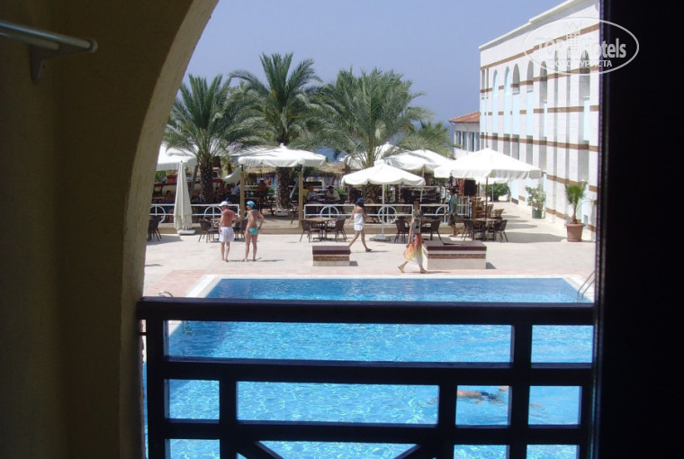 Выгрузили нас быстренько, доплелись мы до ресепшена, у нас взяли документы и сразу дали номер. Портье взял чемоданы и повёл нас по тихой (уже было 2 часа ночи) благоухающей цветами территории. Номер оказался в корпусе у главного бассейна (прямоугольного), номер на 2-м этаже, балкон выходит прямо на бассейн. Нас всё устроило, легли спать.