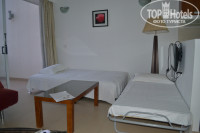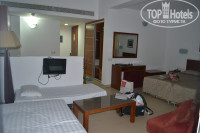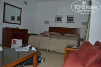 Комната - у нас было 4 кровати!! 2 - стандартные, сдвинутые рядом и 2 просто разложенные - диван и раскладушка в зоне у телевизора. Зачем, не знаем) т.к. нас было двое) тумбочки, столик с зеркалом и еще большое кресло. Фен нашли в последний день в столике)