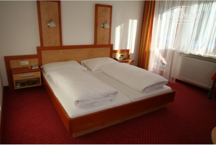 РАЗМЕЩЕНИЕ: рядом с центральным отдельный вход на нижний этаж, где расположена запирающаяся на ключ лыжная комнана и большой сушильный стеллаж для лыжных ботинок и уличной обуви (внутри принято ходить в домашних тапках или шлепанцах); также здесь имеются фитнесс-комната, солярий и сауна (работает с 17.00 до 20.00 за исключением субботы), кухня и комната для завтраков. На нулевом этаже "рецепция" и аппартаменты хозяев, на 1-м и 2-м этажах - аппартаменты для гостей и номера, имеющие выход на общий балкон, где в солнечную погоду приятно принимать солнечные ванны. Центральное расположение лестницы и ее большой просвет не способствуют хорошей звукоизоляции: даже в макимально удаленных от лестницы номерах ночью слышны шаги и голоса запоздалых постояльцев. Номера достаточно просторные, недавно отремонтированные. Из недостатков: плохая вентиляция (при закрытых окнах постоянный запах сырости), телевизоры с очень маленьким экраном (с кровати плохо видно), отсутствие какой-либо посуды в номере (кроме двух стаканов); покрывала также не предусмотрены.