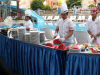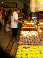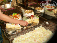 Питание- как везде шведский стол салаты, много зелени. Горячее-2 вида мяса или курица и рыба( но редко), качество мяса не могу оценить, так как ела зелень и рыбу.По утрам омлет или блинчики выпекаемые при вас на улице. Сладости "огорчают"-много и очень вкусные, удержаться очень трудно, особенно удачна пахлава. впервые попробовала луковые кольца в кляре- оказывается вкусно и даже очень, повар красиво готовил в кляре. Плюс еще для деток- на пляже с 11 до 16 готовят перекусы- либо пита либо сендвичи, так же охлажденные напитки 5 видов, кофе и чай.