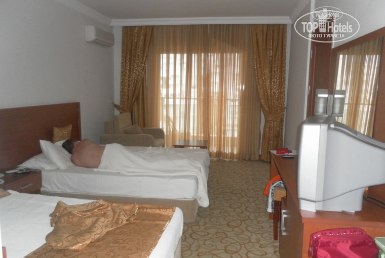 Отдыхали с мужем в этом отеле с 13 по 22 июня. Прочитав последние отзывы, очень переживала, так как мы были в Турции в первый раз. Но нам все понравилось и я поняла, что люди просто зажрались. Мы приехали в отель около 12 дня, пообедали в 12:30(обед был просто шикарный!!!), часик погуляли по территории отеля и до пляжа, в 14:00 нас заселили. Номер очень уютный и чистый. Убирались каждый день, но полотенца меняли через день, постельное белье сменили лишь один раз, но нас это не смутило(дома я делаю все это тоже только раз в неделю, думаю, что никто не делает это каждый день). Еда была отличная! Мясо каждый день(даже шашлыки иногда), фрукты, картошка и многое другое. Единственный недостаток - ПЛЯЖ. Огромные валуны и какая-то труба... Но мы заходили в море с пирса. Аниматоры очень прикольные, обожала их зарядку в 10 утра!!! Детей развлекали с утра до вечера (и мини-клуб, и конкурсы, и водные горки), поэтому там их очень много. Молодым парам не советовала бы этот отель, а всем семьям с детьми "добро пожаловать!" Еще: забыла про прекрасный парк возле отеля, где куча беседок и скамеек!