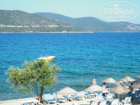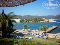 ПЛЯЖ именно такой на картинках отеля, деревянный пирс, с него есть лесенки для входа в море, так же есть заход по относительно мелким камушкам, дно каменистое, ходить по нему очень не приятно, но вода очень чистая и теплая, так что для тех кто плавает все просто супер!