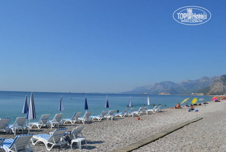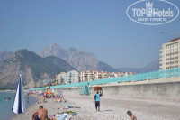Пляж рядом, городской, чистый и ухоженный, пляж галечный и поэтому вода очень и очень чистая. Заход тоже хороший. На пляже можно брать шезлонги на двоих 10 лир (200р ) мужик там хороший работает и шезлонги чистые, а еще у него можно попить заказывать. На пляже открывается шикарный вид на горы.