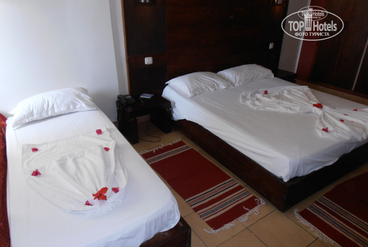 Оформили нас быстро, наверное, за полчаса всех. Нам досталось бунгало, что очень удивило, т.к. в номере 2-спальная кровать и 2-е односпальные. Номер рассчитан на проживание семьи с детьми. Перед входом ниша, столик и стулья. Номер большой, 2 шкафа, тумба, пуфик, холодильник мален., столик, зеркало, кондиционер. Ванна и туалет совмещенный, раковина, зеркало, есть ФЕН (на всех рекламных сайтах фен не указан, мы тоже прочитали и потащили свой – не пригодился.) Конечно не евродизайн, но ведь в принципе, там только ночуешь, всё необходимое было. Какие номера в основном корпусе не знаю, говорят, что маленькие. Да, ещё сейф и телевизор – нужен залог 45 евро за пульт и ключ от сейфа (залог вернут при выезде). Канал только один Россия - hotel, всякая муть, типа « Давай поженимся и Час Суда» крутят не по одному разу. Остальное на других языках. Телевизор не работал, его настроили только через день, после 3-х кратной просьбы. Мы даже не знали, менять нам номер или оставаться. Напротив, через площадку сцена, боялись, не поспишь (но шоу заканчивались в 23:00). Зато рядом выход на пляж и тут же выход к бассейнам (слева и справа от сцены). Решили остаться и не жалеем. С утра выскакивали в первых рядах, занимали получше местечко на пляже и у бассейна и шли завтракать. Нам такое расположение понравилось, а для семьи с детьми кажется вообще удобно, в любой момент можно в номер сбегать при необходимости, не надо по этажам скакать. И днём там тише, от бассейнов шума нет. Иногда репетируют аниматоры свои шоу, но не мешало. Рядом жили немцы с маленьким ребенком, днем он точно спал. Номер убирали каждый день. Деньги мы оставили только в первый и последний день. После первой денежки постель нам украсили цветами. Убирали, не скажу, что это генеральная уборка, но чисто и ладно. Ванну, правда, только раз хорошо отмыли, а потом всегда следы от ног оставались. Паучки у нас тоже на стенах были, а куда денешься, бунгало – это всё равно, что на даче, домик под пальмами. И муравьишки заползали, но мало, мы дверь не оставляли надолго открытую, может поэтому. Потом они такие крохотные, что их почти не видно, попадались почему-то в ванне. Даже ящерку крохотную видели.