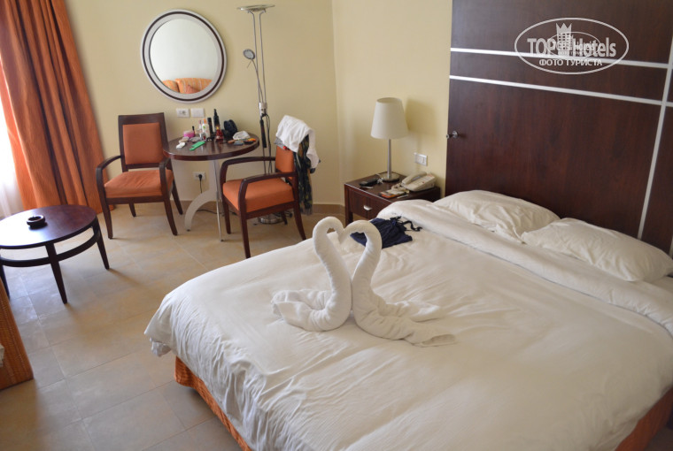 Теперь конкретно про номер: наш Мохамед действительно не обманул, дал очень хороший номер (чайный набор, фен, плазма большая, была даже доска гладильная и утюг!!! №211) на первой линии, отремонтированный также как и номера на второй линии (куда селят иностранцев, считается, что там более кофортабельные номера, но вообще, как нам показалось, на второй линии жить это как-то некомильфо. До моря нужно ездить на автобусе, пешком конечно тоже можно дойти, но шлепать минут 15 по жаре 40 градусов, не айс. Понятное дело, что иностранцев за уши не оттянешь от бассейнов, но мы-то приезжаем на море, не правда ли?) В отеле сейчас действительно проходит ремонт, но как-то перманентно. Еще не все номера отремонтированы. Шума никакого не слышно, только один раз мы слышали шум болгарки днем около основного бассейна на первой линии.