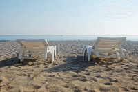 Находится действительно не в двух шагах, а вниз по дороге и через шоссе (-), но от отеля ходит бесплатный автобус (+). Пляж - собственность отеля, лежаки и тэнты бесплатные (+).